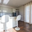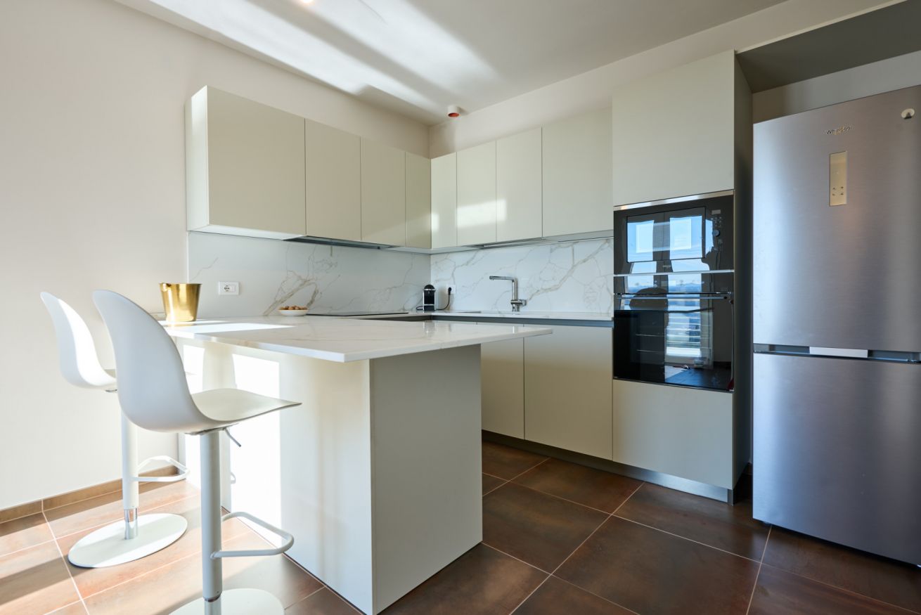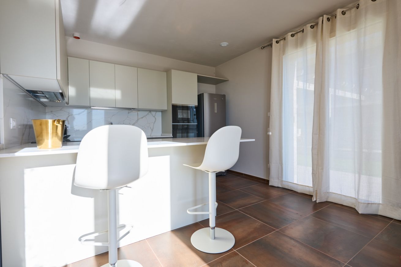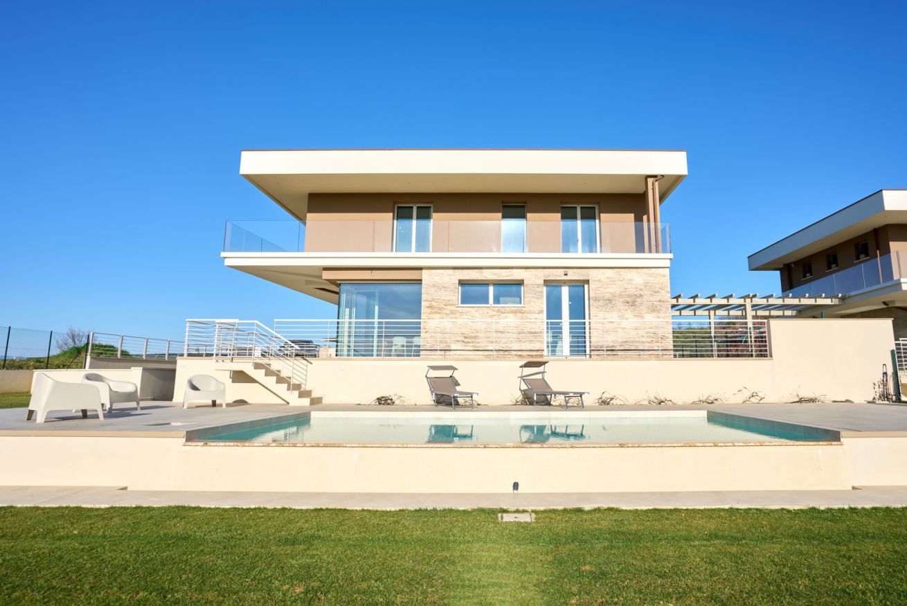 L’ampia cucina, completamente attrezzata, si apre anch’essa verso il loggiato e il grande giardino, dove si trovano un’area barbecue attrezzata, una zona solarium e la piscina: spazi pensati per condividere momenti indimenticabili tra convivialità e relax.