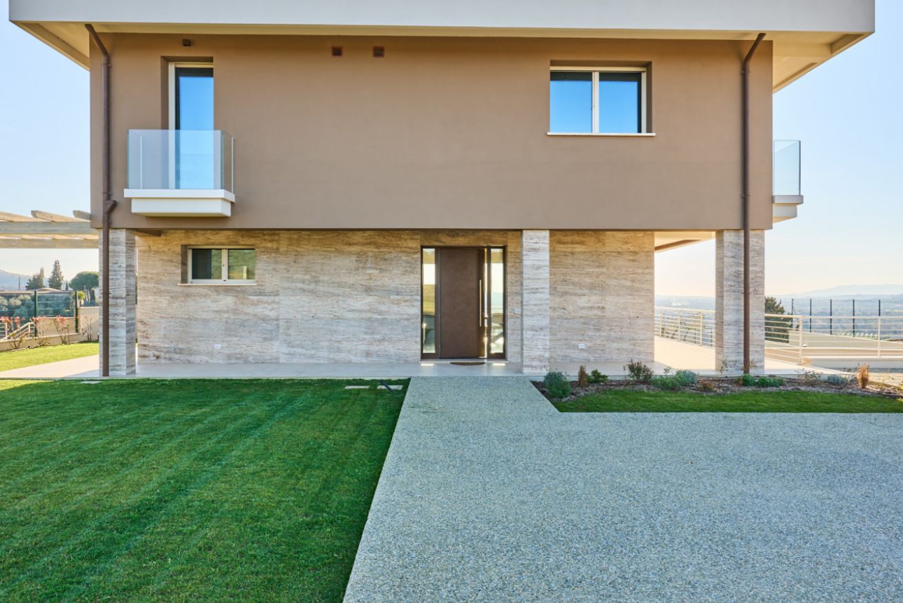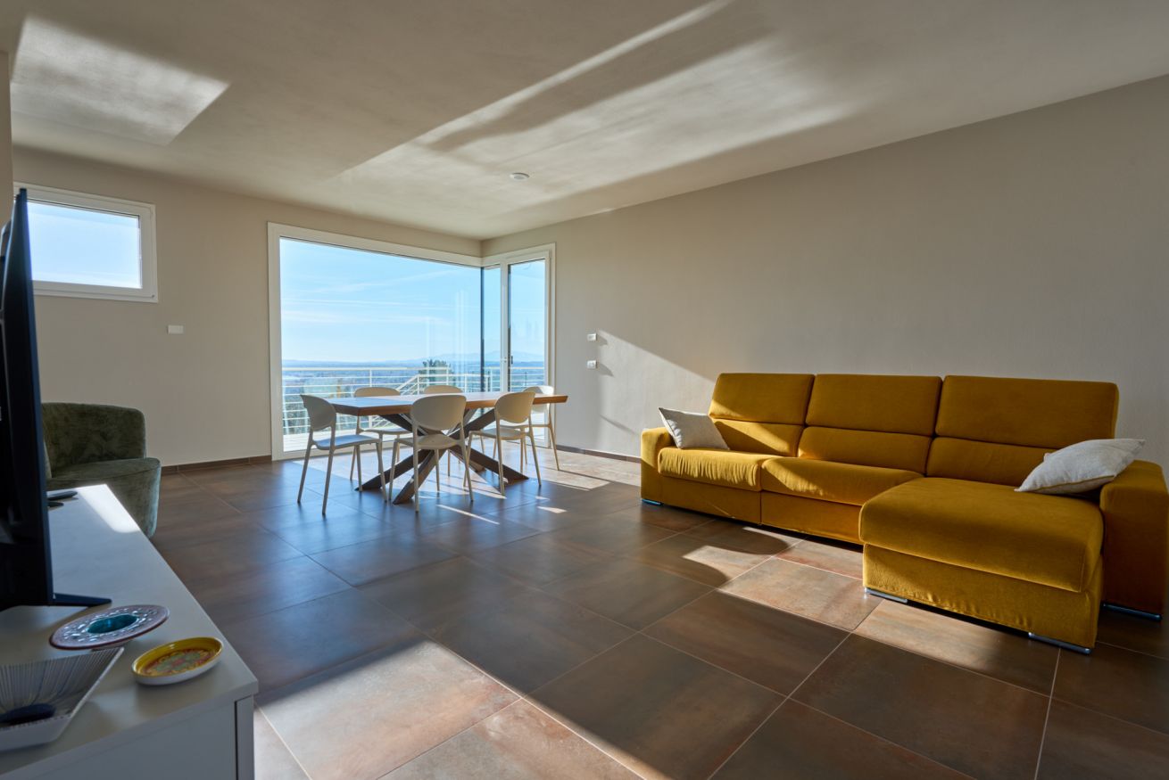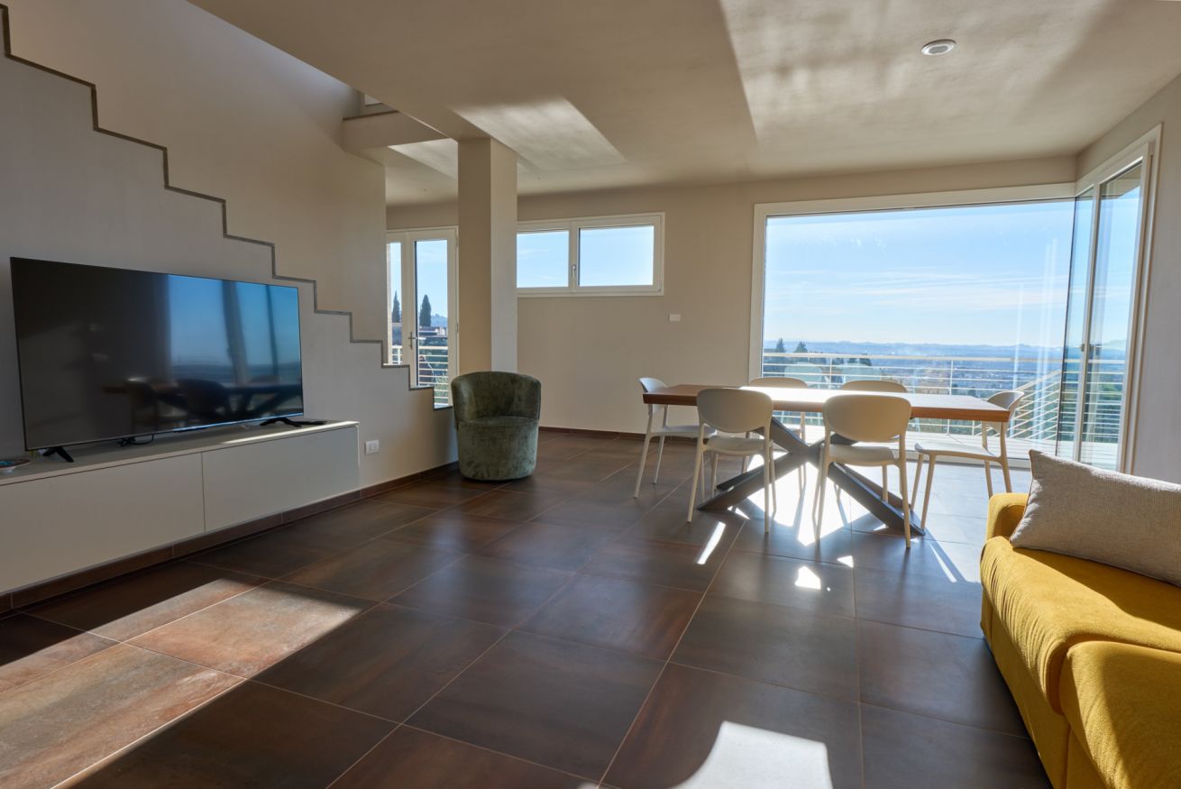 Il piano terra accoglie gli ospiti in un grande e luminoso soggiorno con area relax e Smart TV, impreziosito da un ampio tavolo da pranzo dal quale si gode una splendida vista sul loggiato e sul giardino. Da qui lo sguardo si posa sulla magnifica piscina privata, cuore pulsante degli spazi esterni. A servizio del piano un bagno.